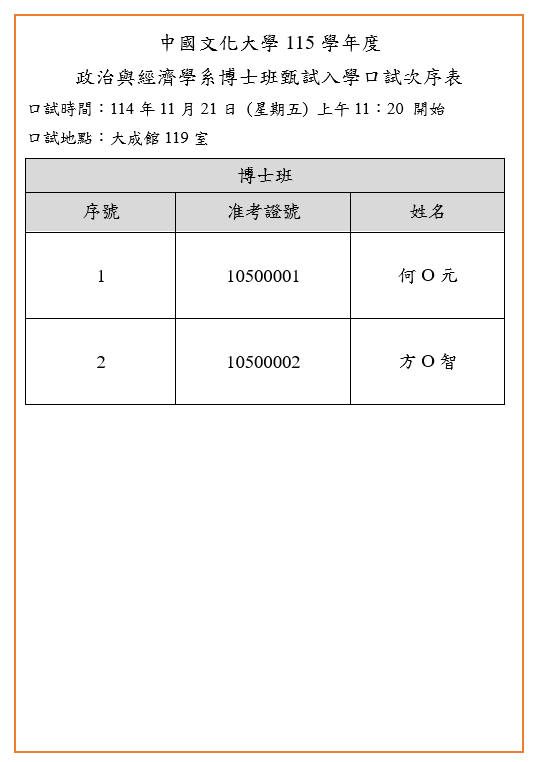 【碩博班甄試入學】中國文化大學115學年度博碩士班甄試入學口試次序表